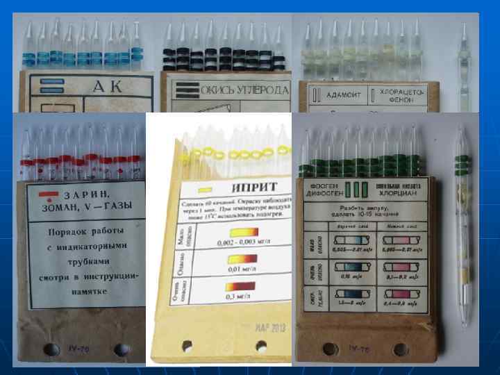 ИНДИКАТОРНЫЕ ТРУБКИ, имеющие одинаковую маркировку, укладываются в кассеты по 10 штук. На лицевой стороне кассеты наклеена этикетка с наименование окраски, возникающей на наполнителе трубки при наличии в воздухе ОВ, и указан порядок работы с данной трубкой.