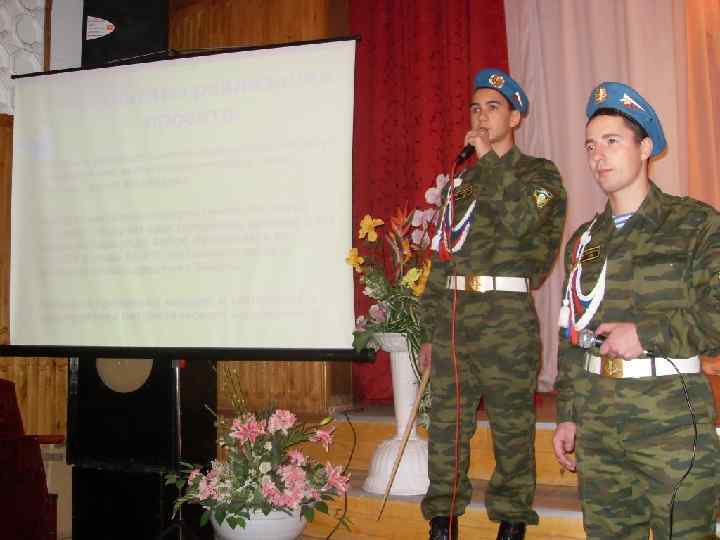 Цель и задачи Цель: n n пропагандировать среди молодёжи истинный патриотизм, честь и славу Российской Армии; воспитывать у молодых людей стремление служить в Вооруженных Силах России, показывать значимость и необходимость выполнения воинского долга Задачи: n n n создание ВПК для подготовки призывников к службе в армии совершенствование военной и физической подготовки призывников воспитание уважения к Российской Армии и подготовка будущих защитников Отечества к военной службе.