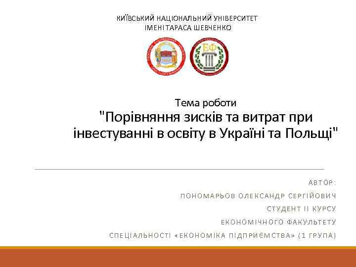КИЇВСЬКИЙ НАЦІОНАЛЬНИЙ УНІВЕРСИТЕТ ІМЕНІ ТАРАСА ШЕВЧЕНКО Тема роботи "Порівняння зисків та витрат при інвестуванні в освіту в Україні та Польщі" АВТОР: ПОНОМАРЬОВ ОЛЕКСАНДР СЕРГІЙОВИЧ СТУДЕНТ ІІ КУРСУ ЕКОНОМІЧНОГО ФАКУЛЬТЕТУ СПЕЦІАЛЬНОСТІ «ЕКОНОМІКА ПІДПРИЄМСТВА» (1 ГРУПА)
