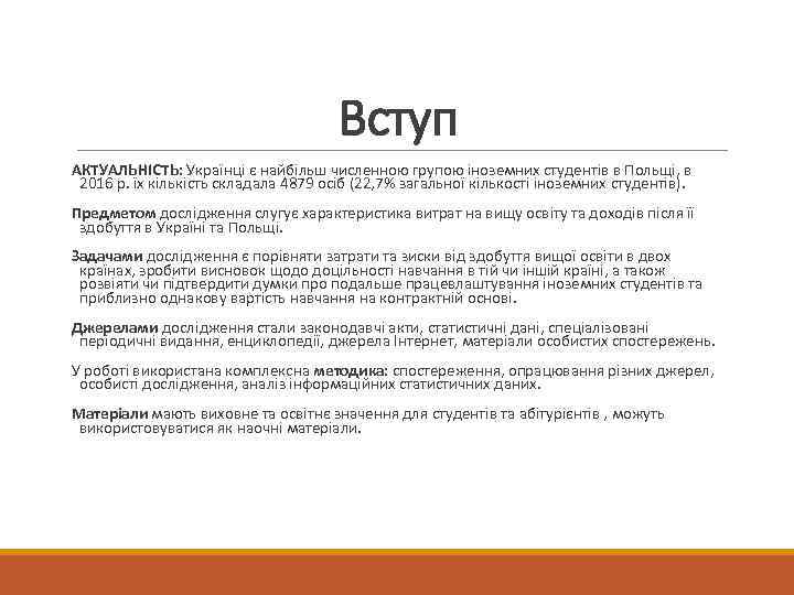 Вступ АКТУАЛЬНІСТЬ: Українці є найбільш численною групою іноземних студентів в Польщі, в 2016 р. їх кількість складала 4879 осіб (22, 7% загальної кількості іноземних студентів). Предметом дослідження слугує характеристика витрат на вищу освіту та доходів після її здобуття в Україні та Польщі. Задачами дослідження є порівняти затрати та зиски від здобуття вищої освіти в двох країнах, зробити висновок щодо доцільності навчання в тій чи іншій країні, а також розвіяти чи підтвердити думки про подальше працевлаштування іноземних студентів та приблизно однакову вартість навчання на контрактній основі. Джерелами дослідження стали законодавчі акти, статистичні дані, спеціалізовані періодичні видання, енциклопедії, джерела Інтернет, матеріали особистих спостережень. У роботі використана комплексна методика: спостереження, опрацювання різних джерел, особисті дослідження, аналіз інформаційних статистичних даних. Матеріали мають виховне та освітнє значення для студентів та абітурієнтів , можуть використовуватися як наочні матеріали.
