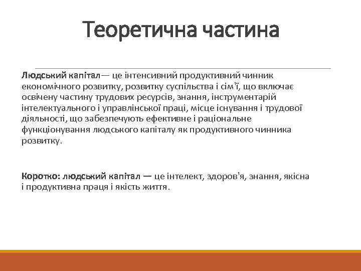 Теоретична частина Людський капітал— це інтенсивний продуктивний чинник економічного розвитку, розвитку суспільства і сім'ї, що включає освічену частину трудових ресурсів, знання, інструментарій інтелектуального і управлінської праці, місце існування і трудової діяльності, що забезпечують ефективне і раціональне функціонування людського капіталу як продуктивного чинника розвитку. Коротко: людський капітал — це інтелект, здоров'я, знання, якісна і продуктивна праця і якість життя.