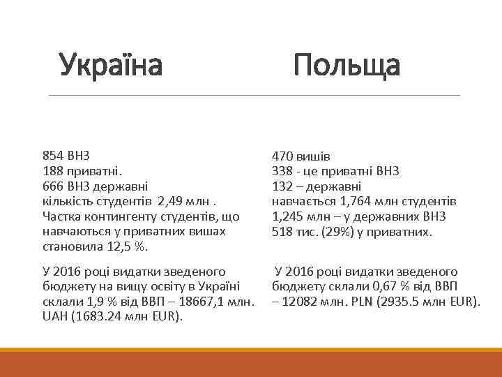 Україна 854 ВНЗ 188 приватні. 666 ВНЗ державні кількість студентів 2, 49 млн. Частка контингенту студентів, що навчаються у приватних вишах становила 12, 5 %. Польща 470 вишів 338 - це приватні ВНЗ 132 – державні навчається 1, 764 млн студентів 1, 245 млн – у державних ВНЗ 518 тис. (29%) у приватних. У 2016 році видатки зведеного бюджету на вищу освіту в Україні бюджету склали 0, 67 % від ВВП склали 1, 9 % від ВВП – 18667, 1 млн. – 12082 млн. PLN (2935. 5 млн EUR). UAH (1683. 24 млн EUR).