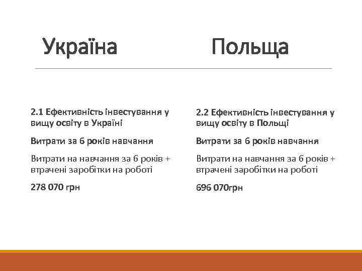 Україна Польща 2. 1 Ефективність інвестування у вищу освіту в Україні 2. 2 Ефективність інвестування у вищу освіту в Польщі Витрати за 6 років навчання Витрати на навчання за 6 років + втрачені заробітки на роботі 278 070 грн 696 070 грн