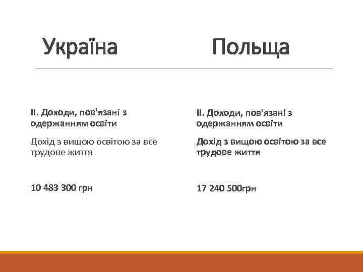 Україна Польща ІІ. Доходи, пов'язані з одержанням освіти Дохід з вищою освітою за все трудове життя 10 483 300 грн 17 240 500 грн