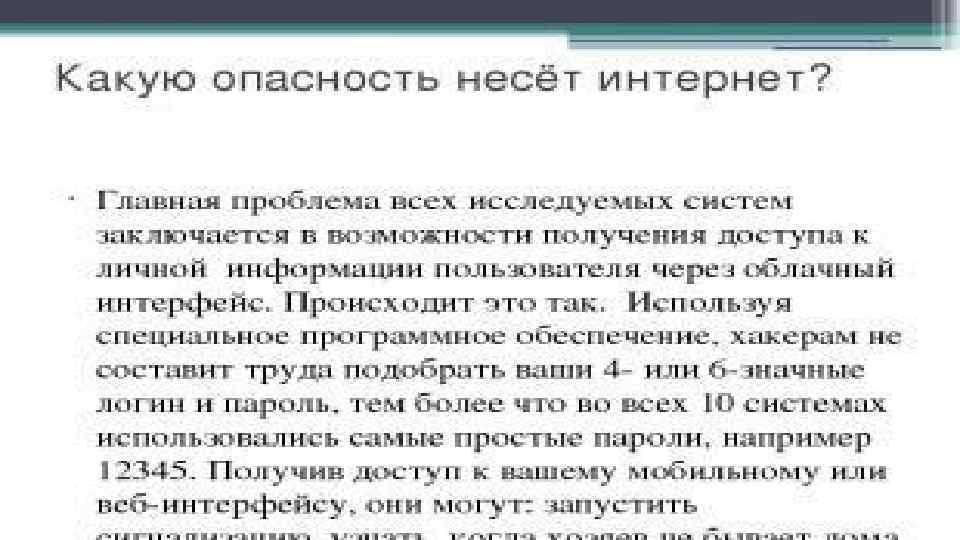 • Какую опасность несёт интернет? Главная проблема всех исследуемых систем заключается в возможности получения доступа к личной информации пользователя через облачный интерфейс. Происходит это так. Используя специальное программное обеспечение, хакерам не составит труда подобрать ваши 4 - или 6 -значные логин и пароль, тем более что во всех 10 системах использовались самые простые пароли, например 12345. Получив доступ к вашему мобильному или вебинтерфейсу, они могут: запустить сигнализацию, узнать, когда хозяев не бывает дома или оценить дом изнутри, посмотрев видео с камер наблюдения.
