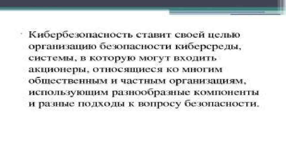 • Кибербезопасность ставит своей целью организацию безопасности киберсреды, системы, в которую могут входить акционеры, относящиеся ко многим общественным и частным организациям, использующим разнообразные компоненты и разные подходы к вопросу безопасности.