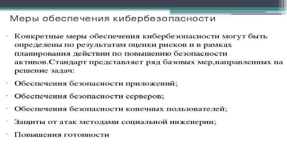• Меры обеспечения кибербезопасности Конкретные меры обеспечения кибербезопасности могут быть определены по результатам оценки рисков и в рамках планирования действии по повышению безопасности активов. Стандарт представляет ряд базовых мер, направленных на решение задач: Обеспечения безопасности приложений; Обеспечения безопасности серверов; Обеспечения безопасности конечных пользователей; Защиты от атак методами социальной инженерии; Повышения готовности