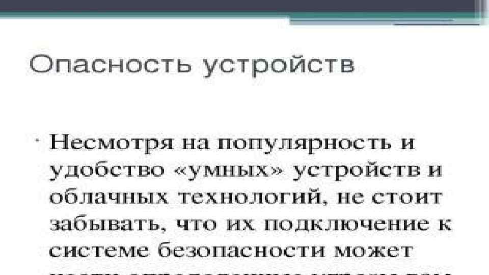 • Опасность устройств Несмотря на популярность и удобство «умных» устройств и облачных технологий, не стоит забывать, что их подключение к системе безопасности может нести определенные угрозы вам и вашим близким при неправильном обращении с ними. Особенно это касается самостоятельно собранных систем, которые в сочетании со слабой защитой сети подвергают ваш дом сетевым атакам или физическим нападениям.