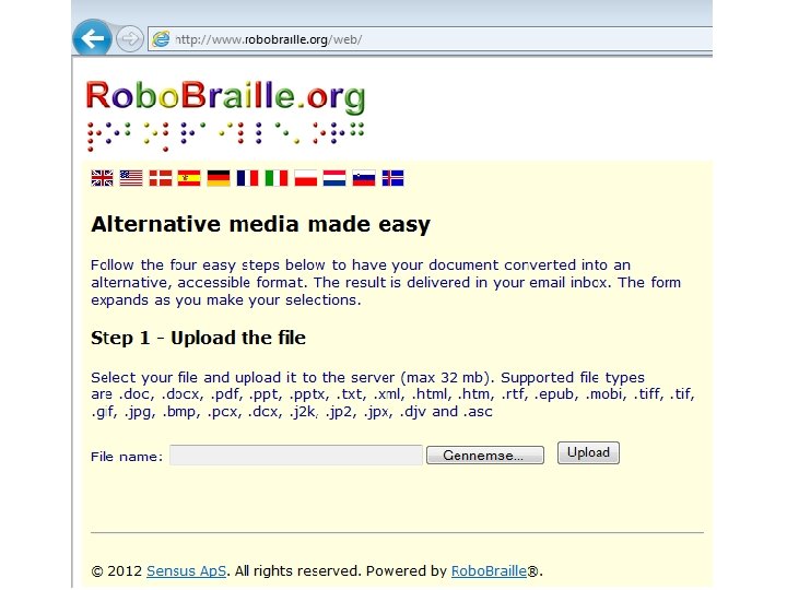 Also an email service … Audio tale@robobraille. org, daisy@robobraille. org, britspeech@robobraille. org, american@robobraille. org, deutsch@robobraille. org Braille sekspunkt@robobraille. org, ottepunkt@robobraille. org, sixdot@robobraille. org, kurzschrift@robobraille. org E-books epub@robobraille. org, mobi@robobraille. org Conversion convert@robobraille. org