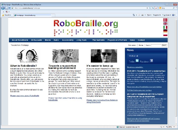 Robo. Braille in Romania and Bulgaria • Localised version of Robo. Braille – Mp 3, Daisy – Braille – E-books – Document conversion – Support for local Braille devices – Localised web interface – Localised web site and other info material – Electronic Library for digital media – Material production