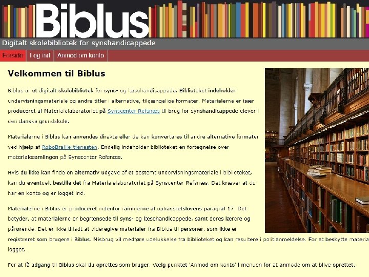 Biblus – A Robo. Braille Companion • Library for digital contents • Two classes of material • Operated in accordance with Danish Copyright legislation (§ 17) • Users • Contents • Delivery