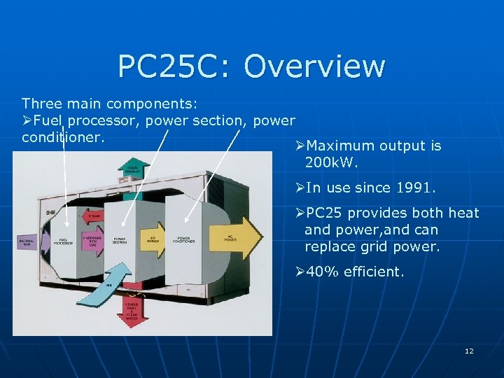 PC 25 C: Overview Three main components: ØFuel processor, power section, power conditioner. ØMaximum output is 200 k. W. ØIn use since 1991. ØPC 25 provides both heat and power, and can replace grid power. Ø 40% efficient. 12