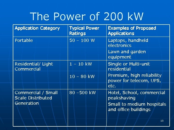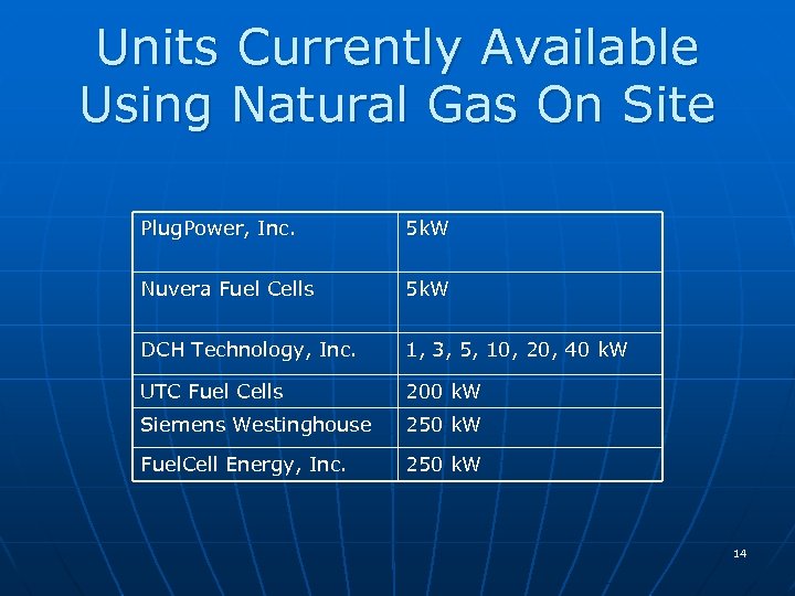 The Power of 200 k. W Application Category Typical Power Ratings Examples of Proposed Applications Portable 50 – 100 W Laptops, handheld electronics Lawn and garden equipment Residential/ Light Commercial 1 – 10 k. W Single or Multi-unit residential Premium, high reliability power for telecom, UPS, etc. 10 – 80 k. W Commercial / Small Scale Distributed Generation 80 – 500 k. W Hotel, School, commercial peakshaving Small to medium hospitals and office buildings 13