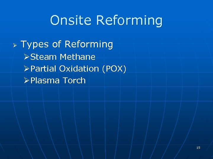 Onsite Reforming Ø Types of Reforming ØSteam Methane ØPartial Oxidation (POX) ØPlasma Torch 15