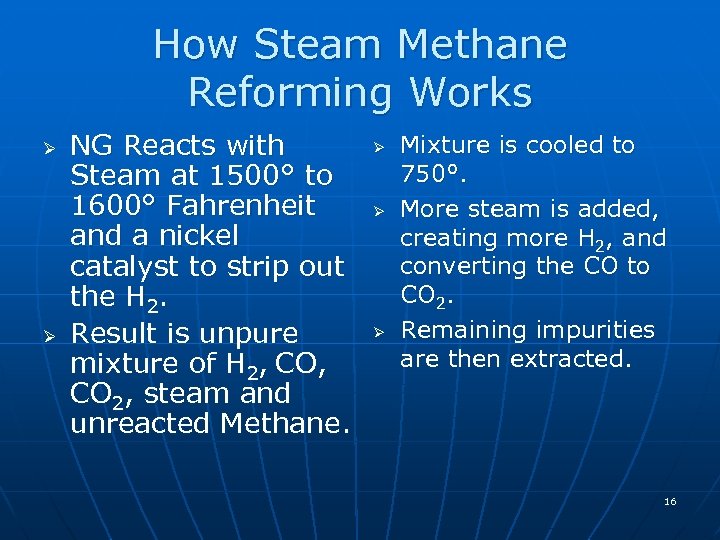 How Steam Methane Reforming Works Ø Ø NG Reacts with Steam at 1500° to 1600° Fahrenheit and a nickel catalyst to strip out the H 2. Result is unpure mixture of H 2, CO 2, steam and unreacted Methane. Ø Ø Ø Mixture is cooled to 750°. More steam is added, creating more H 2, and converting the CO to CO 2. Remaining impurities are then extracted. 16