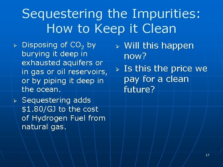 Sequestering the Impurities: How to Keep it Clean Ø Ø Disposing of CO 2 by burying it deep in exhausted aquifers or in gas or oil reservoirs, or by piping it deep in the ocean. Sequestering adds $1. 80/GJ to the cost of Hydrogen Fuel from natural gas. Ø Ø Will this happen now? Is this the price we pay for a clean future? 17
