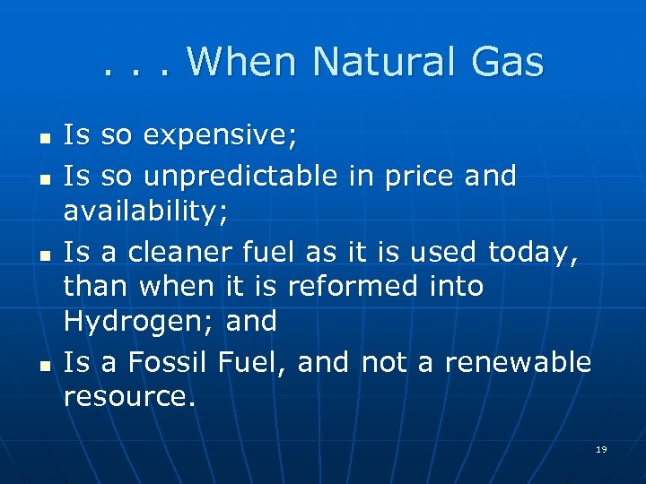 . . . When Natural Gas n n Is so expensive; Is so unpredictable in price and availability; Is a cleaner fuel as it is used today, than when it is reformed into Hydrogen; and Is a Fossil Fuel, and not a renewable resource. 19