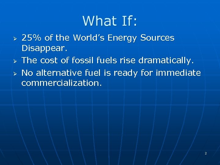 What If: Ø Ø Ø 25% of the World’s Energy Sources Disappear. The cost of fossil fuels rise dramatically. No alternative fuel is ready for immediate commercialization. 2