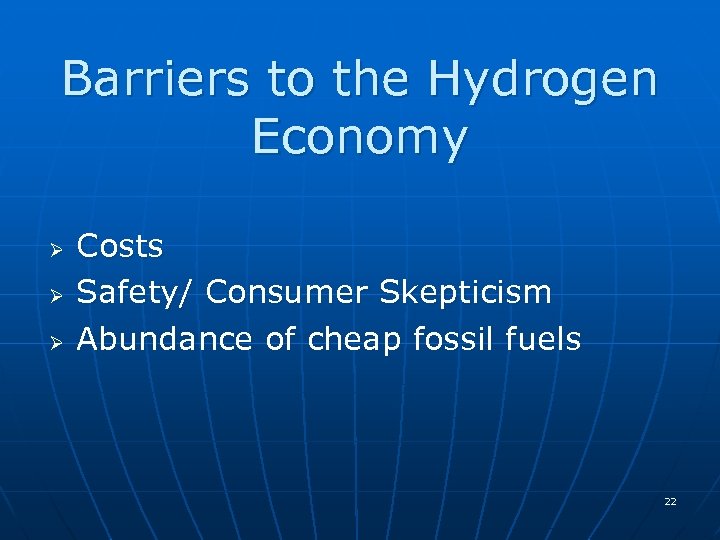 Barriers to the Hydrogen Economy Ø Ø Ø Costs Safety/ Consumer Skepticism Abundance of cheap fossil fuels 22