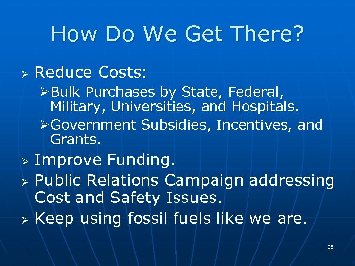 How Do We Get There? Ø Reduce Costs: ØBulk Purchases by State, Federal, Military, Universities, and Hospitals. ØGovernment Subsidies, Incentives, and Grants. Ø Ø Ø Improve Funding. Public Relations Campaign addressing Cost and Safety Issues. Keep using fossil fuels like we are. 23