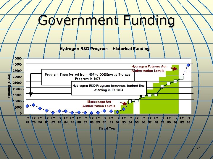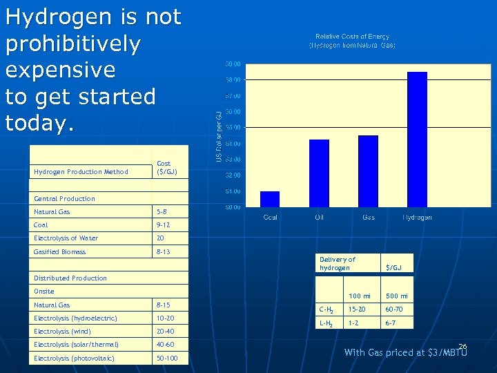 Hydrogen is not prohibitively expensive to get started today. Hydrogen Production Method Cost ($/GJ) Central Production Natural Gas 5 -8 Coal 9 -12 Electrolysis of Water 20 Gasified Biomass 8 -13 Distributed Production Onsite Natural Gas 8 -15 Electrolysis (hydroelectric) 10 -20 Electrolysis (wind) 20 -40 Electrolysis (solar/thermal) 40 -60 Electrolysis (photovoltaic) 50 -100 Delivery of hydrogen $/GJ 100 mi 500 mi C-H 2 15 -20 60 -70 L-H 2 1 -2 6 -7 26 With Gas priced at $3/MBTU