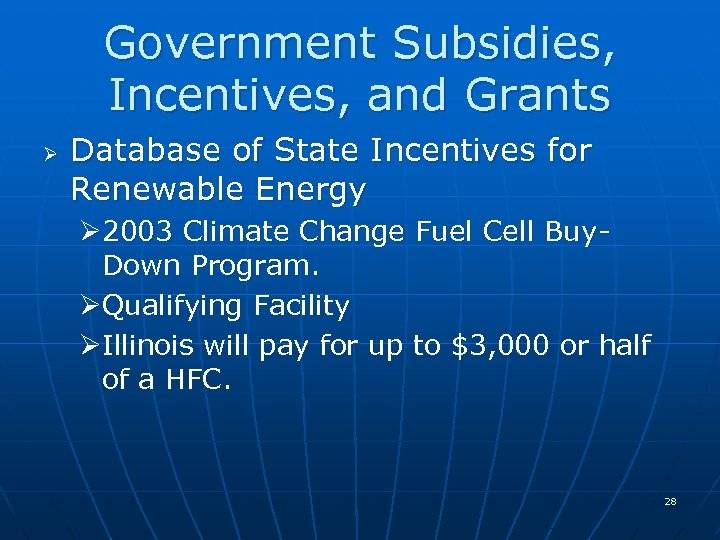Government Subsidies, Incentives, and Grants Ø Database of State Incentives for Renewable Energy Ø 2003 Climate Change Fuel Cell Buy. Down Program. ØQualifying Facility ØIllinois will pay for up to $3, 000 or half of a HFC. 28
