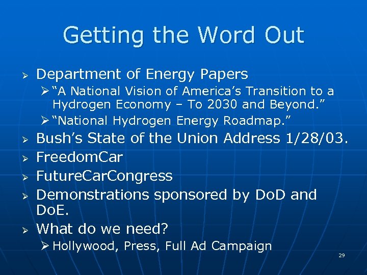 Getting the Word Out Ø Department of Energy Papers Ø “A National Vision of America’s Transition to a Hydrogen Economy – To 2030 and Beyond. ” Ø “National Hydrogen Energy Roadmap. ” Ø Ø Ø Bush’s State of the Union Address 1/28/03. Freedom. Car Future. Car. Congress Demonstrations sponsored by Do. D and Do. E. What do we need? Ø Hollywood, Press, Full Ad Campaign 29