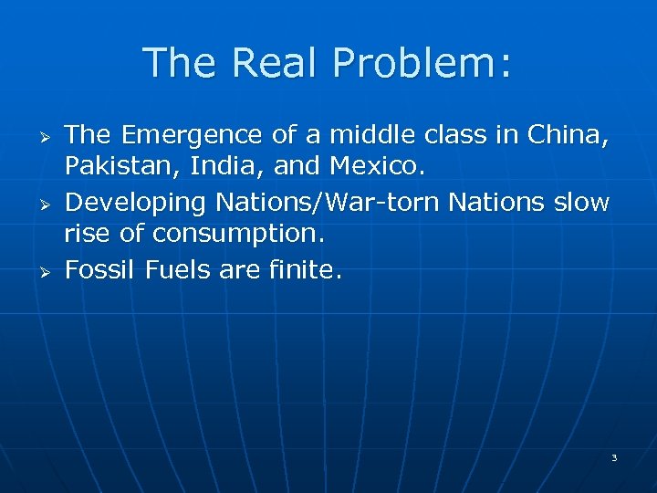 The Real Problem: Ø Ø Ø The Emergence of a middle class in China, Pakistan, India, and Mexico. Developing Nations/War-torn Nations slow rise of consumption. Fossil Fuels are finite. 3