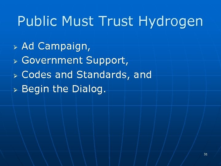 Public Must Trust Hydrogen Ø Ø Ad Campaign, Government Support, Codes and Standards, and Begin the Dialog. 31
