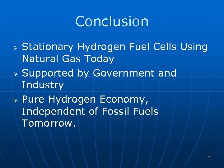 Conclusion Ø Ø Ø Stationary Hydrogen Fuel Cells Using Natural Gas Today Supported by Government and Industry Pure Hydrogen Economy, Independent of Fossil Fuels Tomorrow. 32