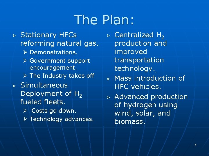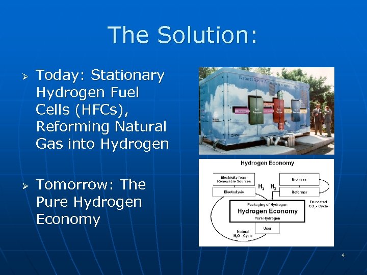The Solution: Ø Ø Today: Stationary Hydrogen Fuel Cells (HFCs), Reforming Natural Gas into Hydrogen Tomorrow: The Pure Hydrogen Economy 4
