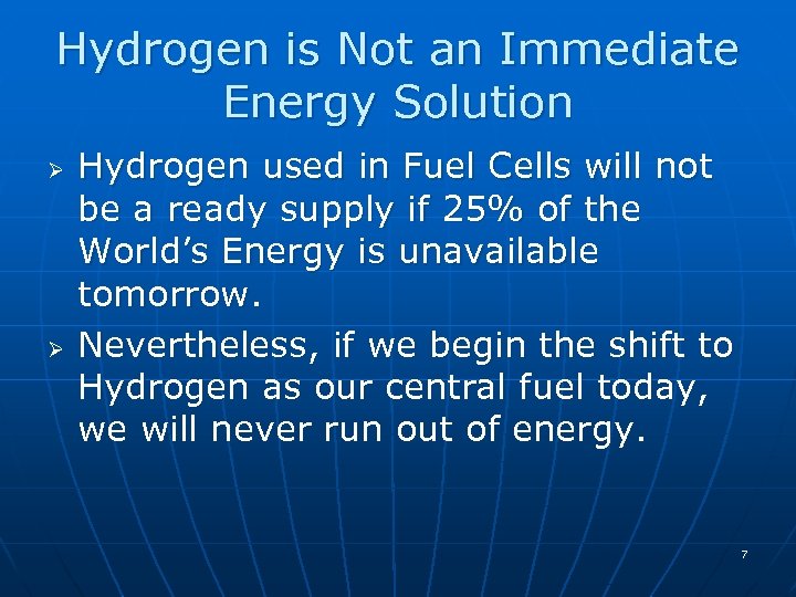 Hydrogen is Not an Immediate Energy Solution Ø Ø Hydrogen used in Fuel Cells will not be a ready supply if 25% of the World’s Energy is unavailable tomorrow. Nevertheless, if we begin the shift to Hydrogen as our central fuel today, we will never run out of energy. 7