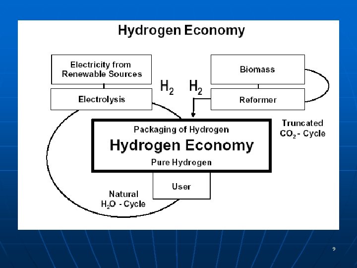 Why Hydrogen? Ø Ø Ø Environmentally clean. Completely renewable. Present everywhere. Present in our current energy resources. Storable. Nationally independent, individually independent 8