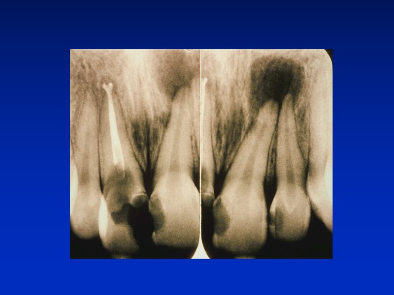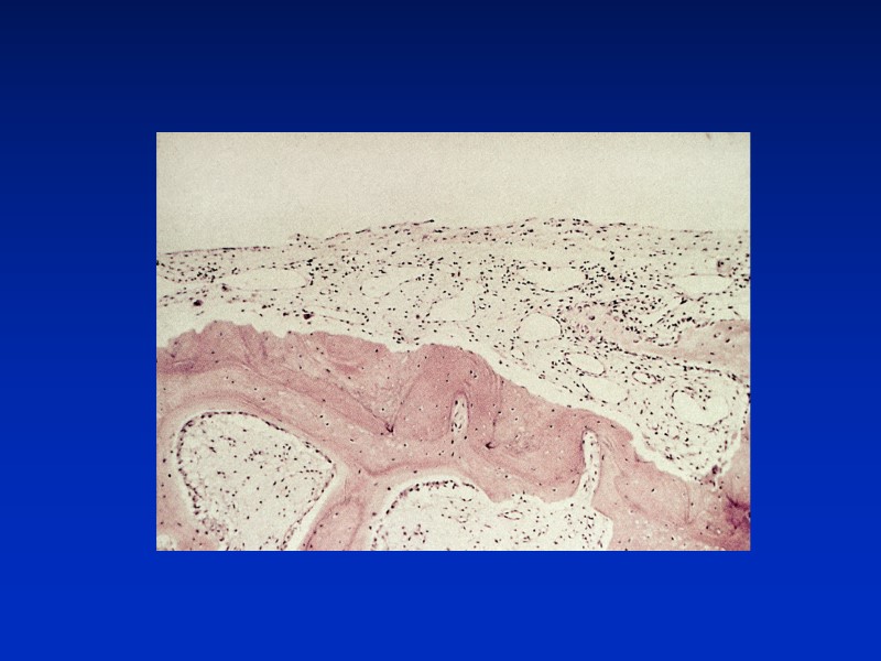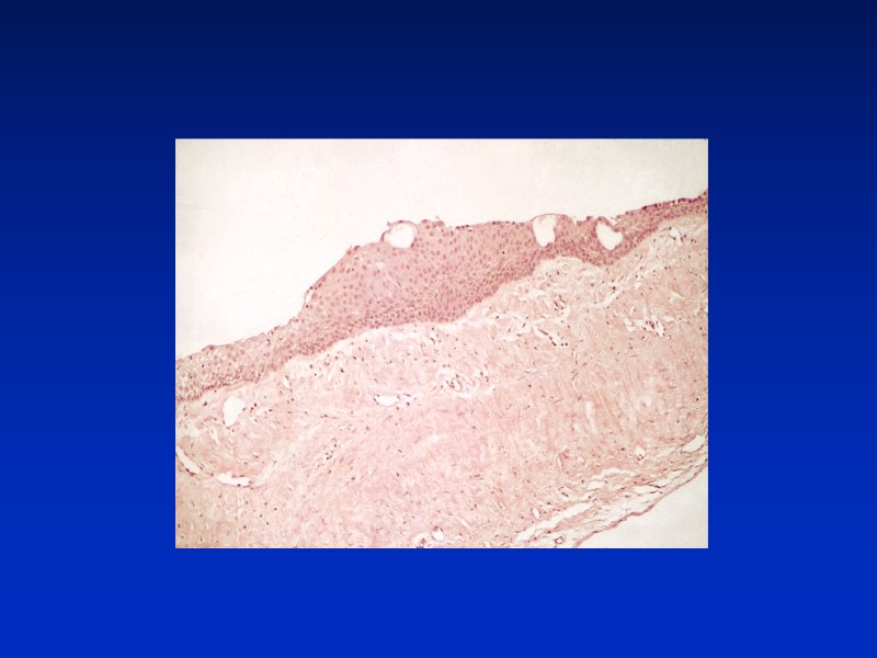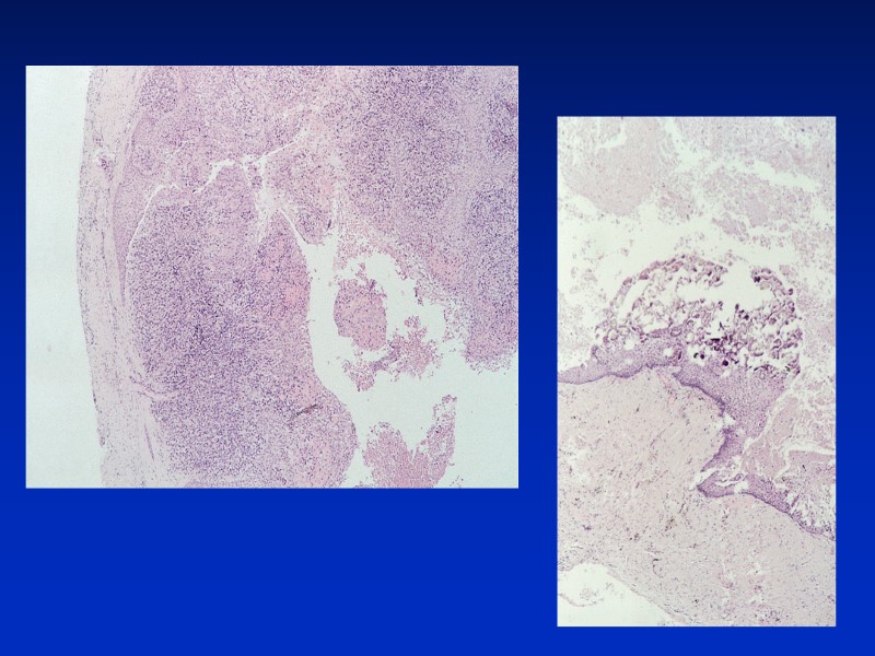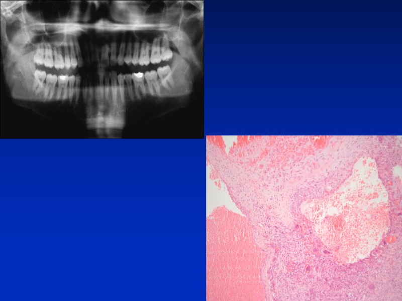 Radikuläre Zyste Ät: Entzündung Lok: OK, Frontalregion Alter: 30-40 Rö: umschriebene Osteolyse, apikal-lateral-parodontal Histo: nicht verhornendes Plattenepithel mit entzündlich durchsetztem Zystenbalg