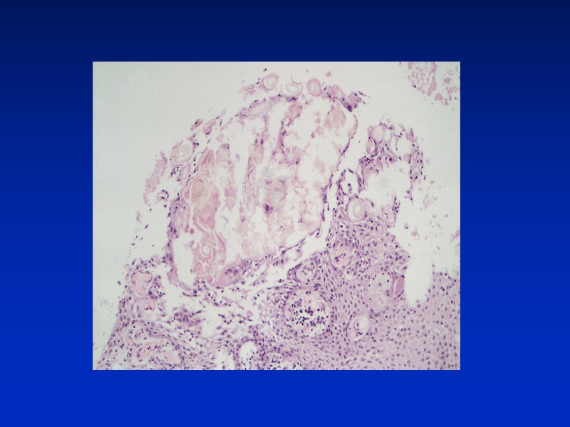 Gingivale Zyste des Kindes (Epstein Perlen) Lok: extraossär, im Bereich des Alveolarfortsatzes Rö: negativ Alter: 1 Lj Ausgang: Reste der Zahnleiste Histo: Plattenepithel mit Parakeratose , im Lumen Keratinlamellen