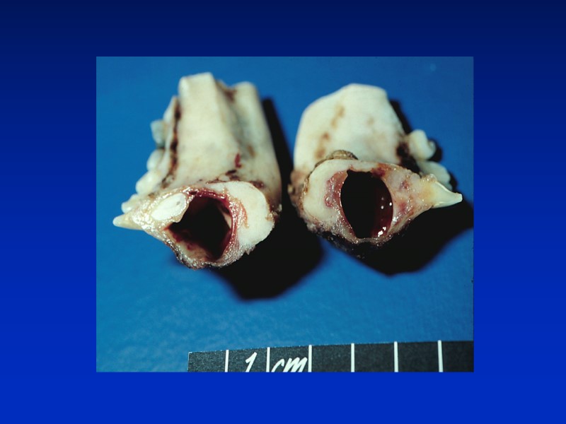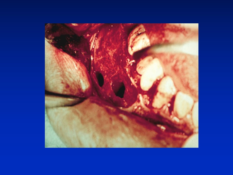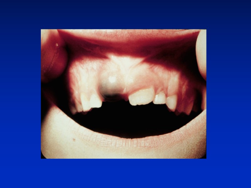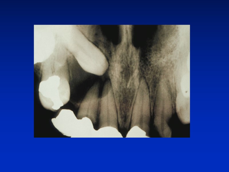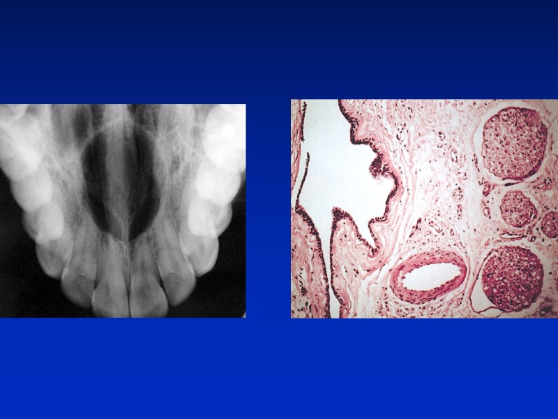 Nasopalatinale Zyste Ät: dysontogenetische Zyste Lok: OK Incisivusregion Alter: 40 - 60 Rö: Osteolyse, 1- 2 cm Histo: unverhornendes Plattenepithel, im Zystenbalg Gefäße , Nerven , Drüsen