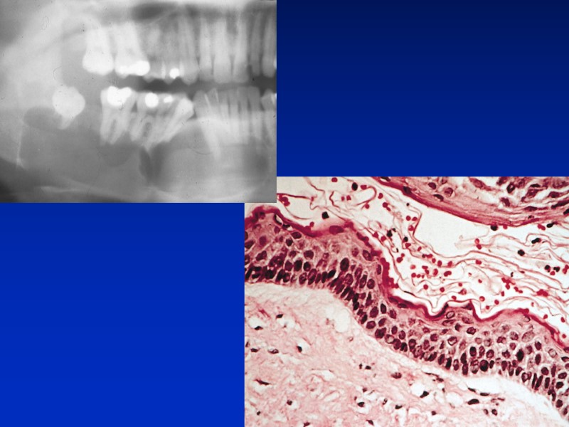 Follikuläre Zyste Ät: dysontogenetische Zyste Lok: OK- Caninusregion, UK- 3 Molar Alter: 20 - 40 Rö: scharf umschriebene Osteolyse mit Zahnkrone, zentral- lateral-zirkulär Histo: unverhornendes Plattenepithel aus 2- 5 Zellagen mit entzündungsfreiem Zystenbalg, bei Entzündung Proliferation des Epithels