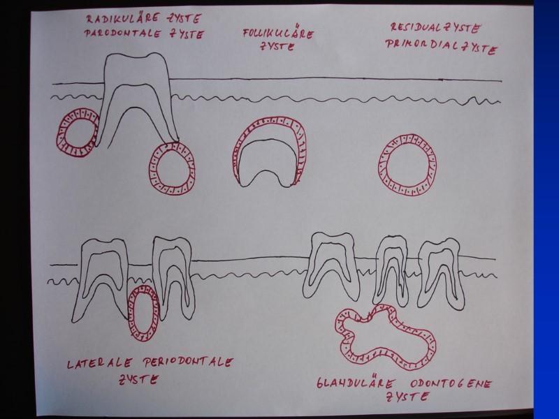 Dentogene Zysten nach WHO 2017 Dysontogenetische Zysten: gingivale Zyste der Kinder ( Epstein Perlen) gingivale Zyste des Erwachsenen follikuläre Zyste/ Eruptionszyste/ Primordialzyste glanduläre odontogene Zyste laterale periodontale Zyste odontogene Keratozyste kalzifizierende odontogene Zyste orthokeratinisierende odontogene Zyste Entzündungsbedingte Zysten: radikuläre Zyste ( apikal, lateral) und parodontale Zyste Residualzyste
