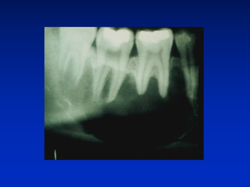 Solitäre Knochenzyste (traumatische, einfache, hämorrhagische) Ät: nicht geklärt Lok: UK Alter: 10-20 Rö: unilokuläre Osteolyse Histo: Pseudozyste ohne Epithel mit lockerem Zystenbalg N. alveolaris mandibularis verläuft durch die Höhle wie Telefondraht