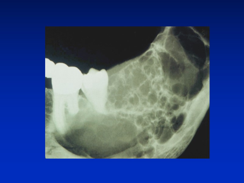Myxom lokal invasiv wachsender ectomesenchymaler Tumor ohne Kapsel multilokuläre Osteolyse (Seifenblasen) myxoide Matrix mit spindeligen Zellen, wenig Kollagen, kleinste Epithelnester DD hyperplastischer Follikel eines retinierten Zahnes