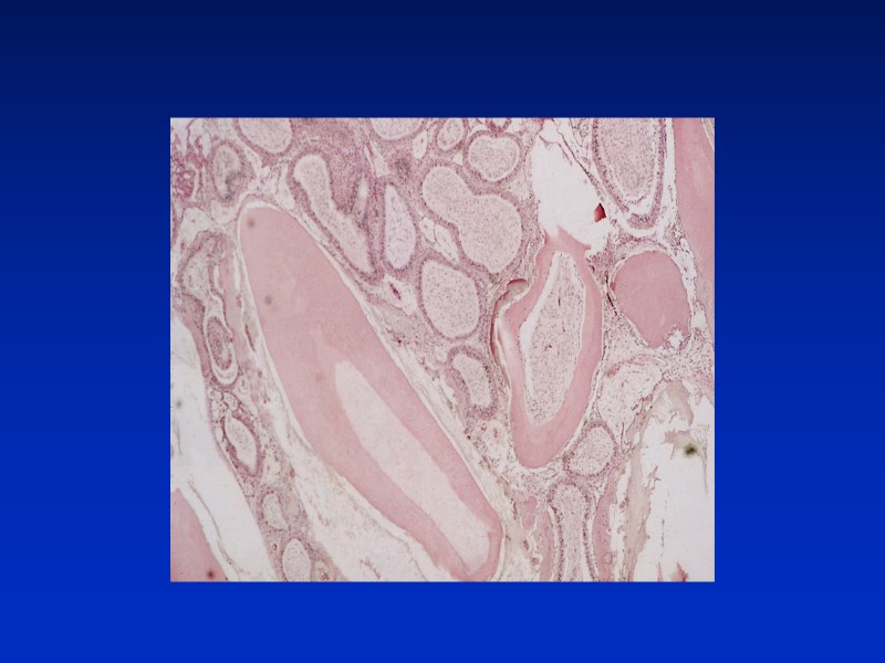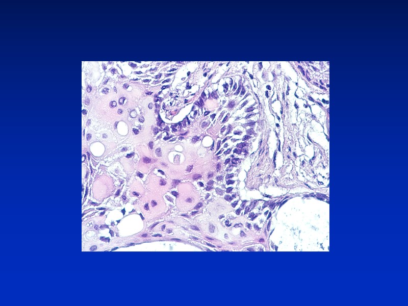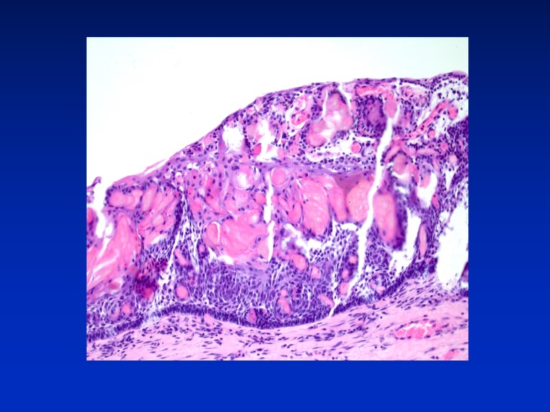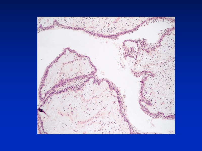 Glanduläre odontogene Zyste oder sialoodontogene Zyste ÄT: dysontogenetische Zyste mit aktivem Wachstum Lok: OK, UK Frontalregion Alter: 30- 50 RÖ: uni-oder multilokuläre Osteolyse Histo: teils Plattenepithel, teils cuboidale Zellen mit Ausbildung von papillären oder glandulären Formationen, Flimmerepithel, Schleimzellen lockerer Zystenbalg