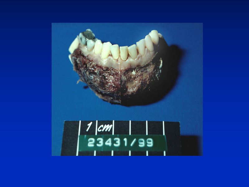 Floride zemento-ossäre Dysplasie (gigantoformes Zementoblastom) benigne nicht neoplastische Läsion mit multiplem Vorkommen, manchmal familiär gehäuftes Auftreten 30 - 50, w > m Rö: multiple röntgendichte lobulierte Herde (DD chron diff skler OM) Zementmassen ohne zelluläre Bestandteile, teils mit Zahnwurzel verschmolzen Komp: Größe , sekundäre OM