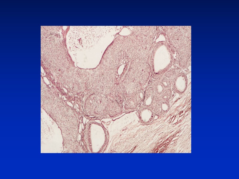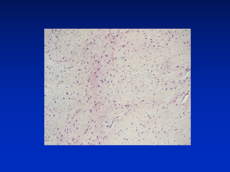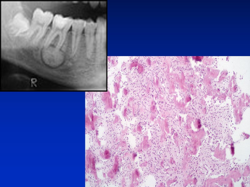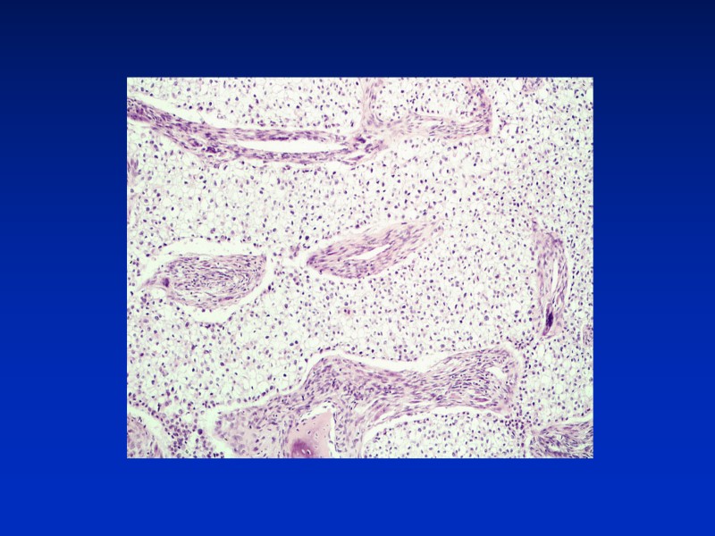 Odontogenes Fibrom benigner ectomesenchymaler Tumor mit Resten von inaktivem odontogenem Epithel 20- 50 OK, UK scharf abgrenzbare Osteolyse Stroma mit reichlich Kollagen und Fibroblasten, eingelagert kleine Epithelnester, selten Verkalkungen, Knochenbälkchen selten extraossär DD peripheres ossifizierendes Fibrom ( Epulis fibrosa)