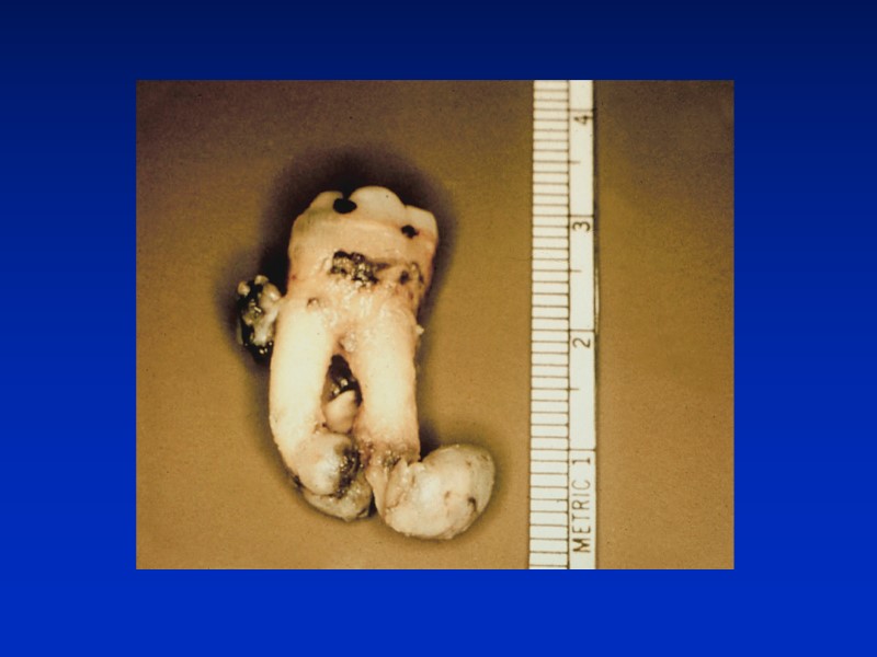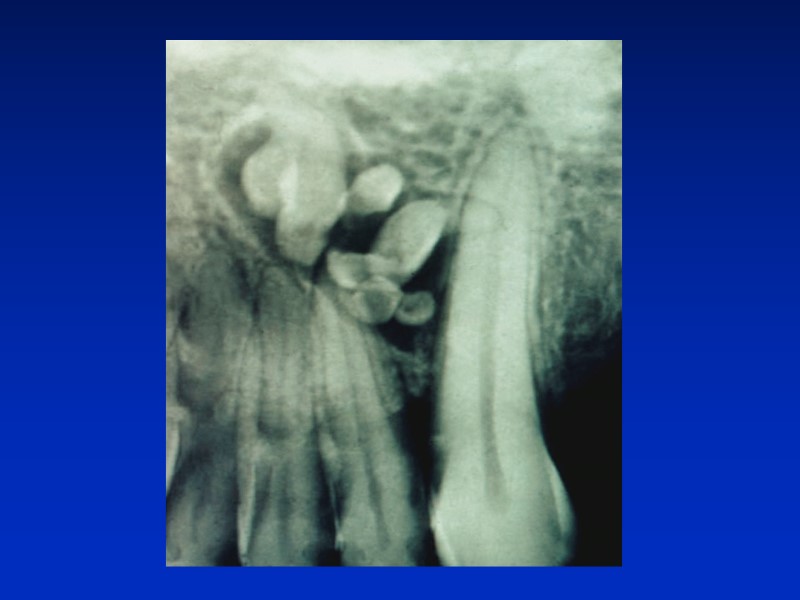 Odontom complex = gemischt compound = zusammengesetzt 5-20 Lj. teils in Kombination mit retiniertem Zahn oder einer dentogenen Zyste röntgendichte knollige Strukturen oder Zähne umgeben von röntgendurchlässigem Saum complex: ungeordnete Zahnhartsubstanzen compound : geordnete Zahnhartrubstanzen DD: Gemini-Fehlbildung
