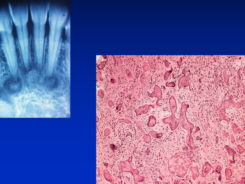 Zementoblastom benigner ectomesenchymer Tumor 20-30 UK, Molar- und Prämolarregion röntgendichte Struktur mit umgebendem osteolytischem Saum und Wurzelresorption dichte Zementmassen mit basophilen Kittlinien, Stroma mit großen Zementoblasten und Zementoklasten in der Peripherie unmineralisierter Zement (im restl. Skelett Osteoblastom)