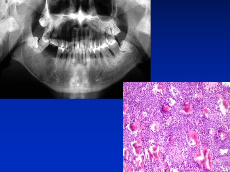Ossifizierendes Fibrom zemento-ossifizierendes Fibrom juveniles trabekuläres oss. Fibrom juveniles psammomatoides oss. Fibrom Unterschied Alter und Lokalisation benigner Tumor mit scharfer Grenze und Kapsel scharf abgrenzbare Osteolyse mit röntgendichten Strukturen fibröses Stroma mit Zementpartikel und/oder Geflechtknochenbälkchen mit umgebenden Osteoblasten