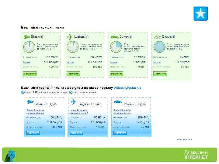 Основные преимущества Домашнего Интернета от Киевстар • • • • • Технология FTTB. Кольцевая система. Бесплатное подключение. Бесплатная служба поддержка 24/7. Нет договоров. Безлимитные тарифы. Видео-портал, с доступом к бесплатному видео. Удобная и понятная схема снятие абонентской платы. Бесплатный роутер. Временное приостановление. Увеличение скорости Турбо Неделя День/Ночь, Тест Драйв. Личный кабинет. Доступ к персональной информации. Бесплатная замена тарифного плана. Бонусы. Услуга Мастер. Центр семейной безопасности. Удобное пополнение счета.