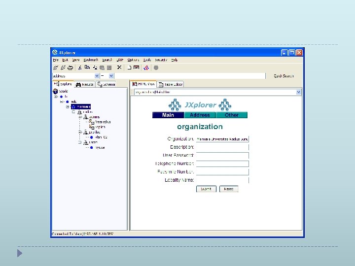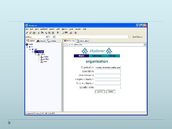 LDAP Data Interchange. Files (LDIF) base. ldif dn: dc=marmara, dc=edu, dc=tr objectclass: dc. Object objectclass: organization o: Marmara Universitesi LDAP Sunucusu dc: marmara #ldapadd -H ldap: //127. 0. 0. 1 -x -D "cn=root, dc=marmara, dc=edu, dc=tr" -f base. ldif –W