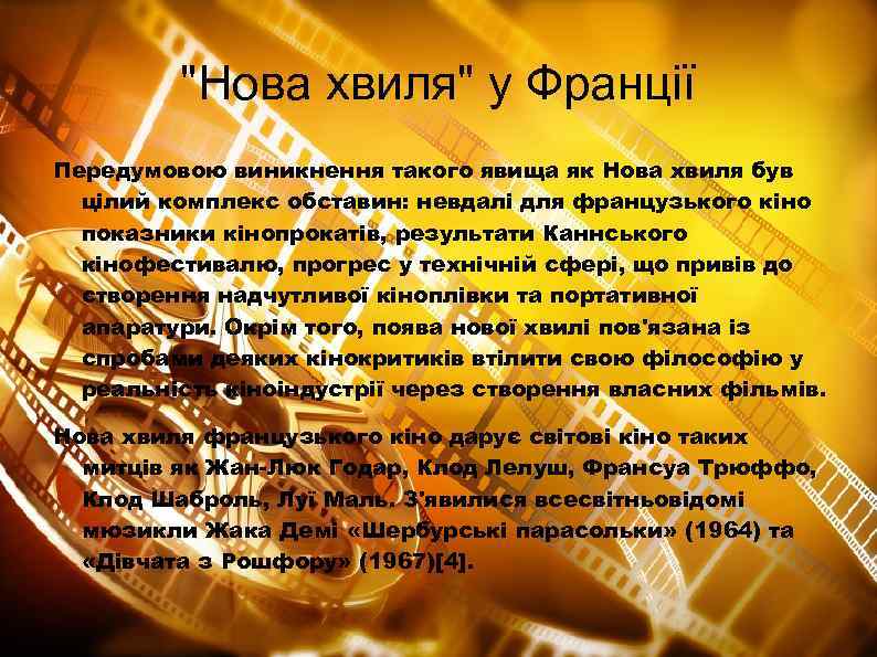 "Нова хвиля" у Франції Передумовою виникнення такого явища як Нова хвиля був цілий комплекс обставин: невдалі для французького кіно показники кінопрокатів, результати Каннського кінофестивалю, прогрес у технічній сфері, що привів до створення надчутливої кіноплівки та портативної апаратури. Окрім того, поява нової хвилі пов'язана із спробами деяких кінокритиків втілити свою філософію у реальність кіноіндустрії через створення власних фільмів. Нова хвиля французького кіно дарує світові кіно таких митців як Жан-Люк Годар, Клод Лелуш, Франсуа Трюффо, Клод Шаброль, Луї Маль. З'явилися всесвітньовідомі мюзикли Жака Демі «Шербурські парасольки» (1964) та «Дівчата з Рошфору» (1967)[4].