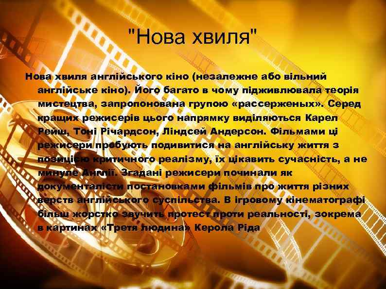 "Нова хвиля" Нова хвиля англійського кіно (незалежне або вільний англійське кіно). Його багато в чому підживлювала теорія мистецтва, запропонована групою «рассерженых» . Серед кращих режисерів цього напрямку виділяються Карел Рейш, Тоні Річардсон, Ліндсей Андерсон. Фільмами ці режисери пробують подивитися на англійську життя з позицією критичного реалізму, їх цікавить сучасність, а не минуле Англії. Згадані режисери починали як документалісти постановками фільмів про життя різних верств англійського суспільства. В ігровому кінематографі більш жорстко звучить протест проти реальності, зокрема в картинах «Третя людина» Керола Ріда